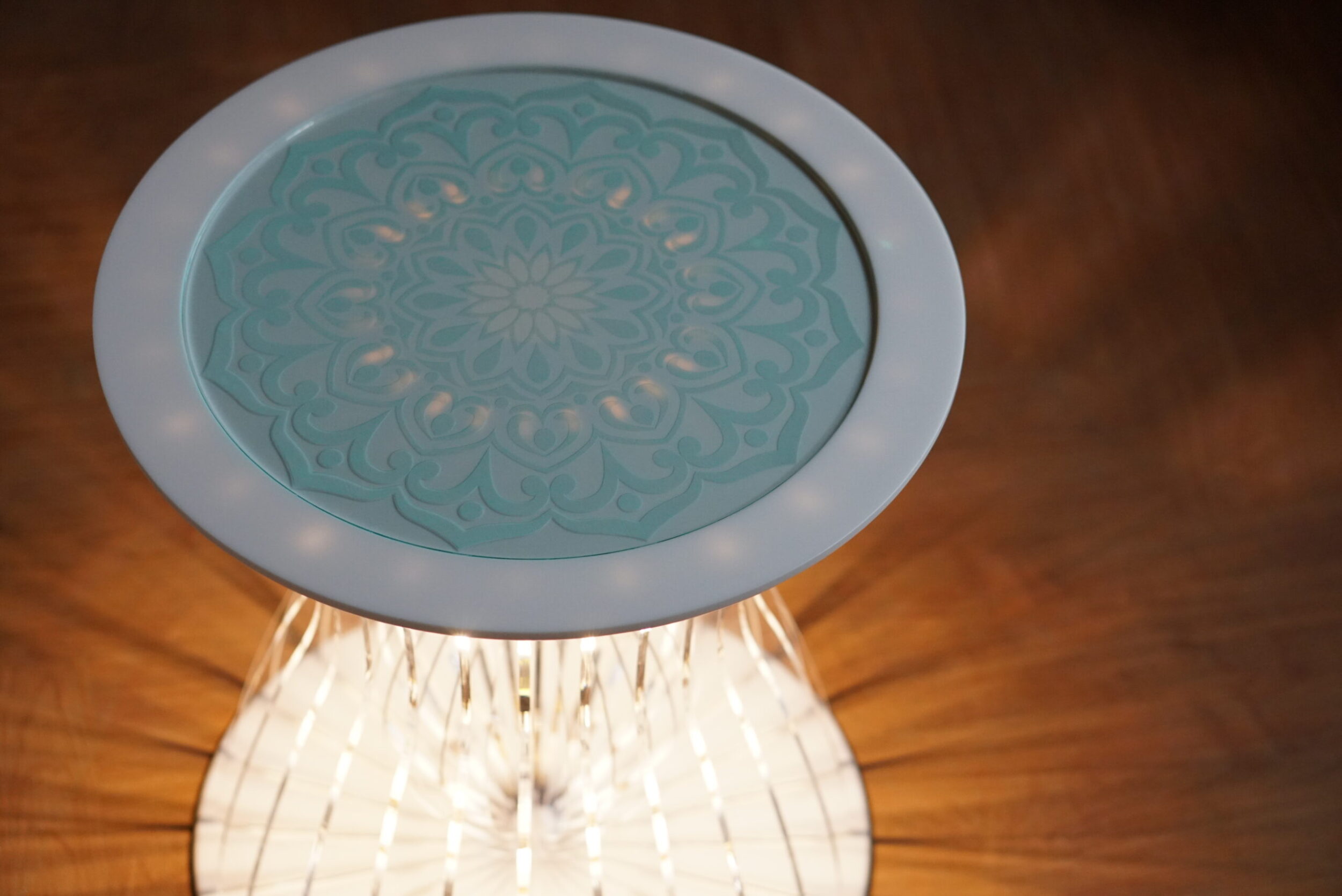 ライトを点灯すると、アクリル素材ならではの透明感と光の屈折により、美しい陰影が周囲に広がり、空間をドラマチックに演出します。