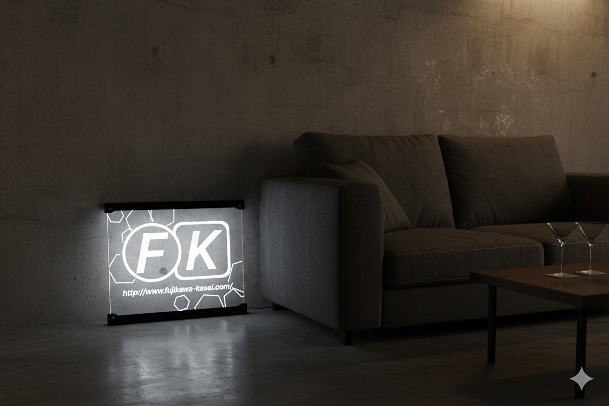 店舗の入り口、展示ブース、オフィス、イベント会場など、あらゆる空間にマッチするデザイン性と機能性を兼ね備え、電気に繋げばレーザーで印字したロゴなどが発光し顧客の視線を自然に惹きつけます。